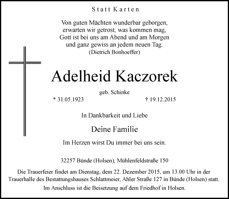 Hier finden Sie alle Traueranzeigen aus der Zeitung, die bisher für Adelheid Kaczorek erschienen sind. Weitere Traueranzeigen, die in der Zeitung erscheinen, werden hier ebenfalls aufgelistet