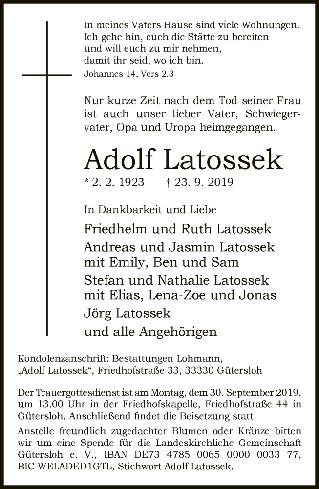 Hier finden Sie alle Traueranzeigen aus der Zeitung, die bisher für Adolf Latossek erschienen sind. Weitere Traueranzeigen, die in der Zeitung erscheinen, werden hier ebenfalls aufgelistet