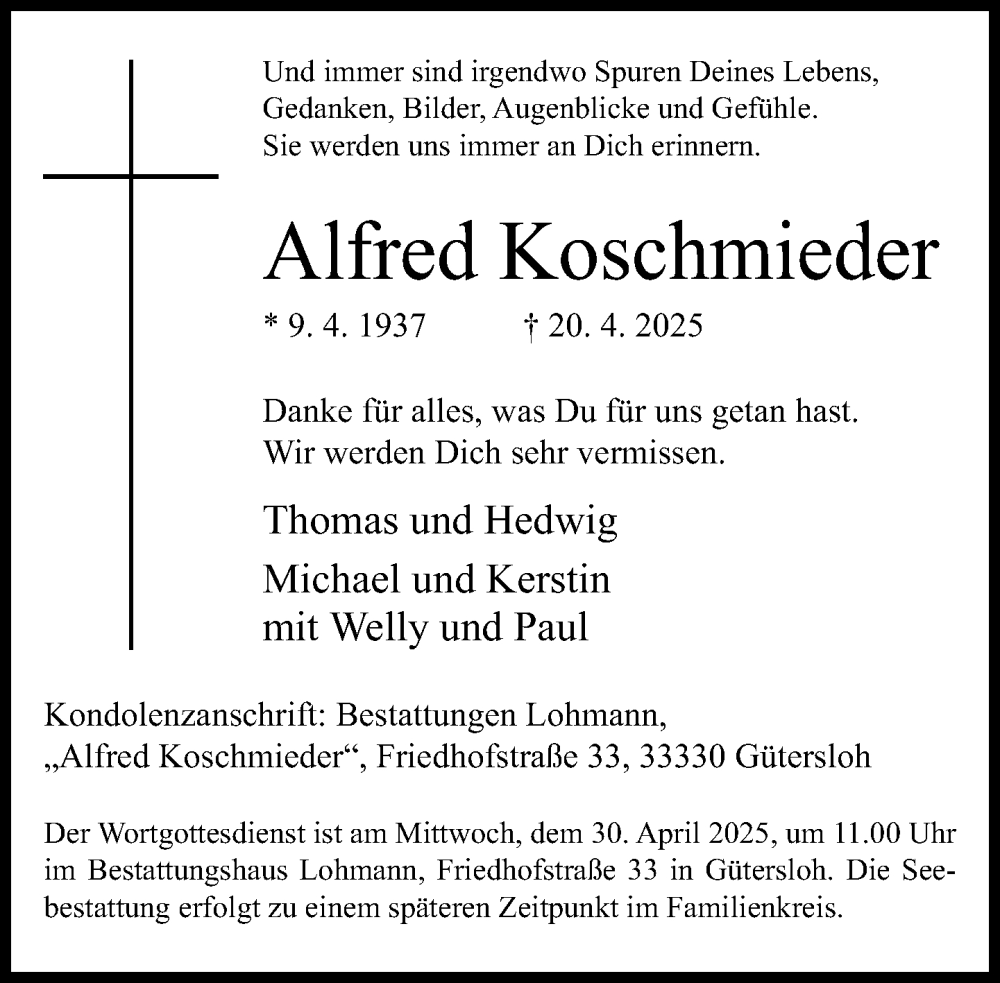 Hier finden Sie alle Traueranzeigen aus der Zeitung, die bisher für Alfred Koschmieder erschienen sind. Weitere Traueranzeigen, die in der Zeitung erscheinen, werden hier ebenfalls aufgelistet