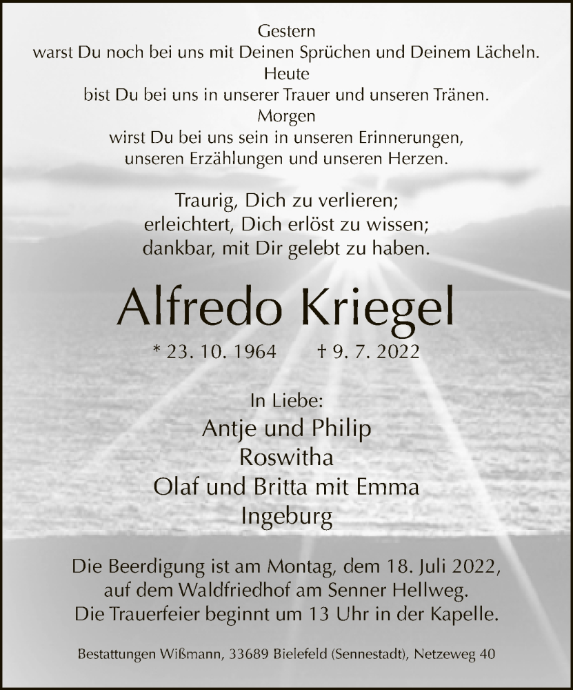Hier finden Sie alle Traueranzeigen aus der Zeitung, die bisher für Alfredo Kriegel erschienen sind. Weitere Traueranzeigen, die in der Zeitung erscheinen, werden hier ebenfalls aufgelistet