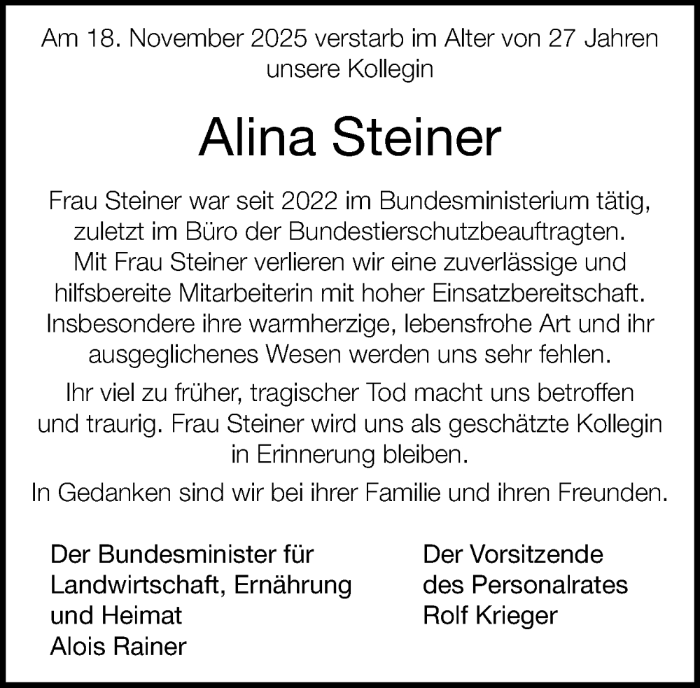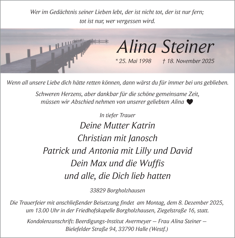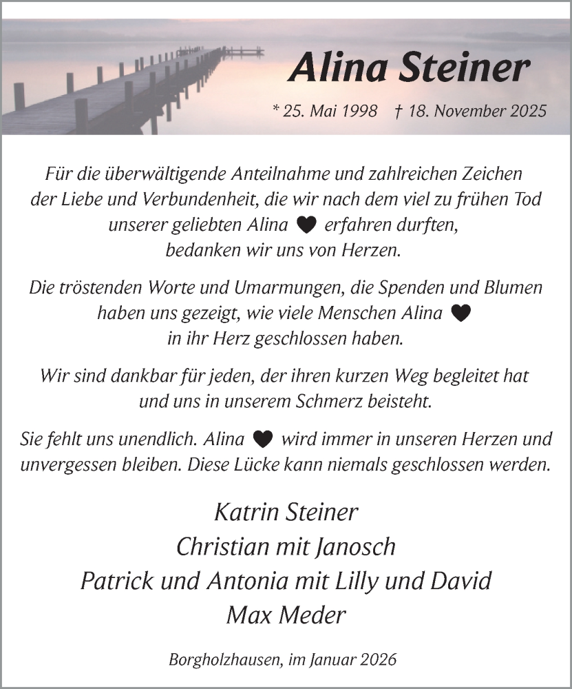 Hier finden Sie alle Traueranzeigen aus der Zeitung, die bisher für Alina Steiner erschienen sind. Weitere Traueranzeigen, die in der Zeitung erscheinen, werden hier ebenfalls aufgelistet