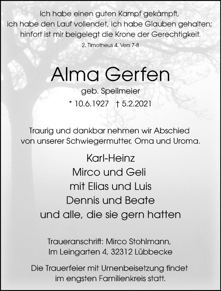 Hier finden Sie alle Traueranzeigen aus der Zeitung, die bisher für Alma Gerfen erschienen sind. Weitere Traueranzeigen, die in der Zeitung erscheinen, werden hier ebenfalls aufgelistet