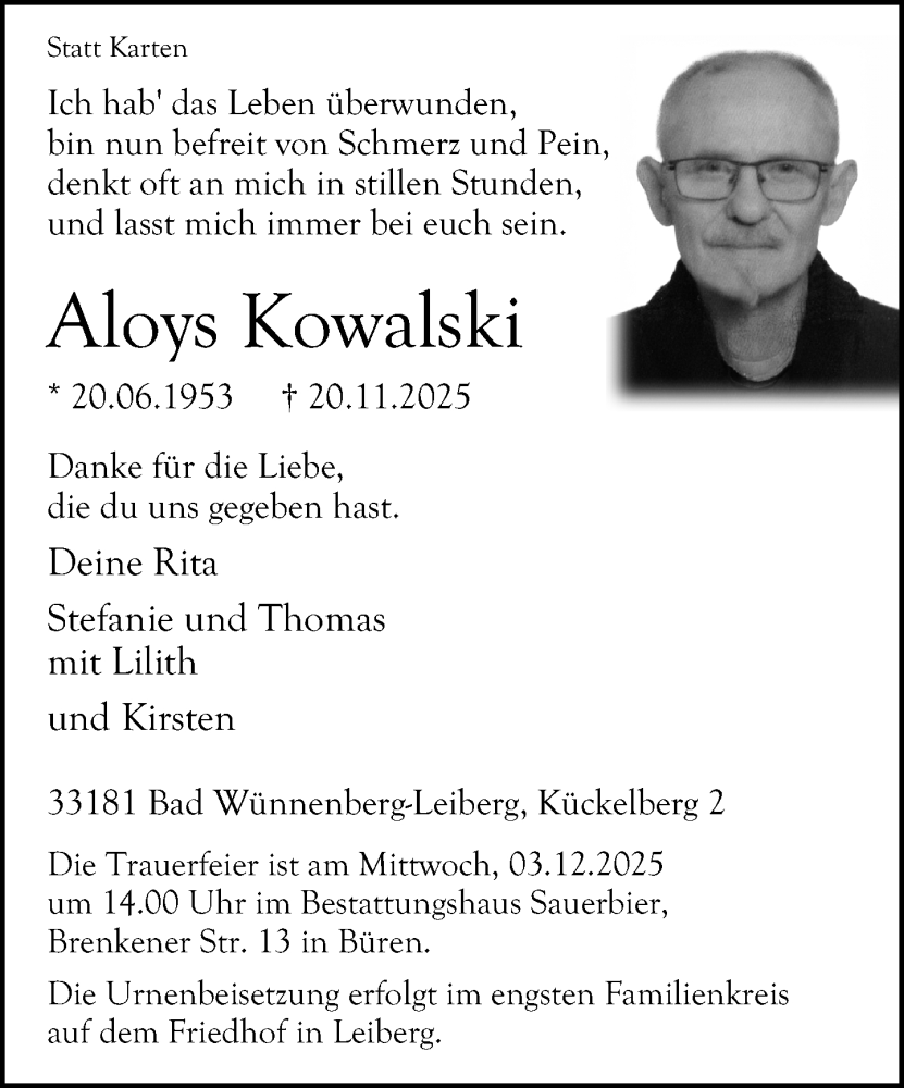 Hier finden Sie alle Traueranzeigen aus der Zeitung, die bisher für Aloys Kowalski erschienen sind. Weitere Traueranzeigen, die in der Zeitung erscheinen, werden hier ebenfalls aufgelistet