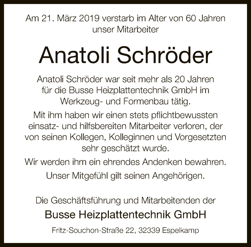 Hier finden Sie alle Traueranzeigen aus der Zeitung, die bisher für Anatoli Schröder erschienen sind. Weitere Traueranzeigen, die in der Zeitung erscheinen, werden hier ebenfalls aufgelistet