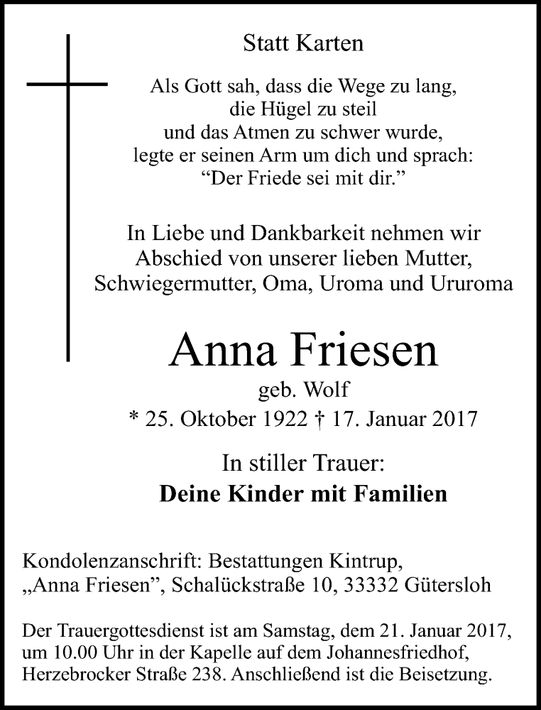 Hier finden Sie alle Traueranzeigen aus der Zeitung, die bisher für Anna Friesen erschienen sind. Weitere Traueranzeigen, die in der Zeitung erscheinen, werden hier ebenfalls aufgelistet