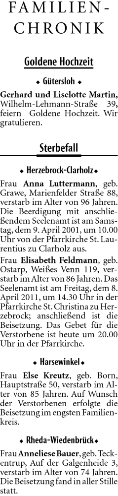 Hier finden Sie alle Traueranzeigen aus der Zeitung, die bisher für Anna Luttermann erschienen sind. Weitere Traueranzeigen, die in der Zeitung erscheinen, werden hier ebenfalls aufgelistet