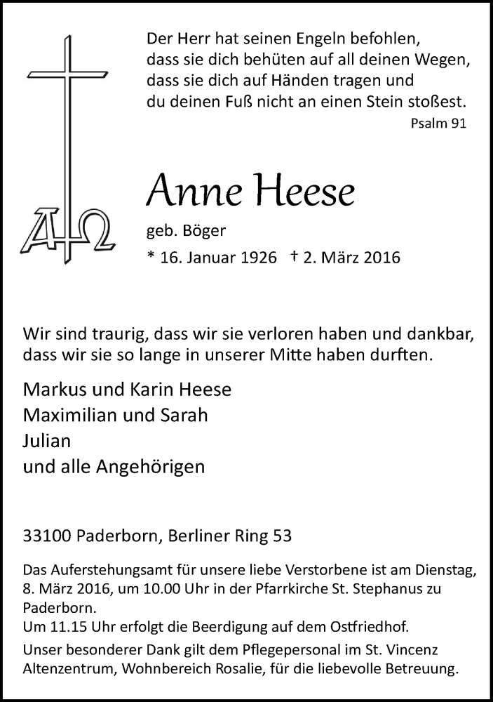 Hier finden Sie alle Traueranzeigen aus der Zeitung, die bisher für Anne Heese erschienen sind. Weitere Traueranzeigen, die in der Zeitung erscheinen, werden hier ebenfalls aufgelistet