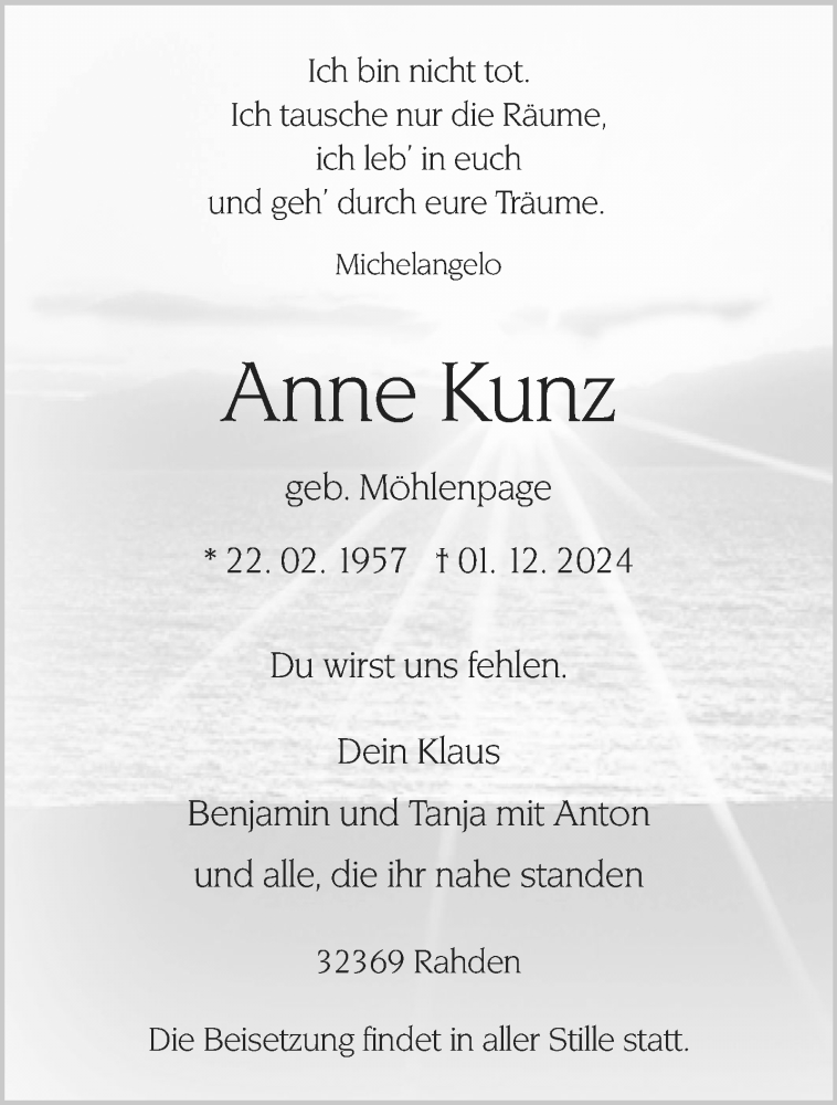 Hier finden Sie alle Traueranzeigen aus der Zeitung, die bisher für Anne Kunz erschienen sind. Weitere Traueranzeigen, die in der Zeitung erscheinen, werden hier ebenfalls aufgelistet