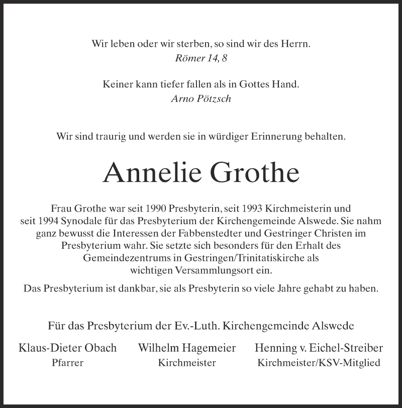 Hier finden Sie alle Traueranzeigen aus der Zeitung, die bisher für Annelie Grothe erschienen sind. Weitere Traueranzeigen, die in der Zeitung erscheinen, werden hier ebenfalls aufgelistet