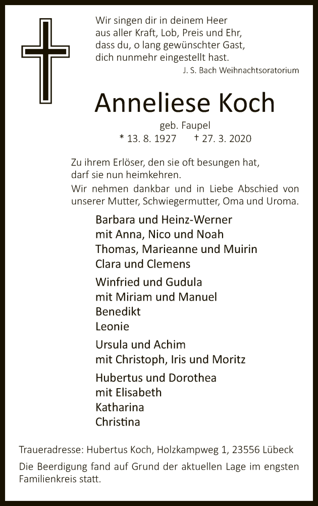 Hier finden Sie alle Traueranzeigen aus der Zeitung, die bisher für Anneliese Koch erschienen sind. Weitere Traueranzeigen, die in der Zeitung erscheinen, werden hier ebenfalls aufgelistet