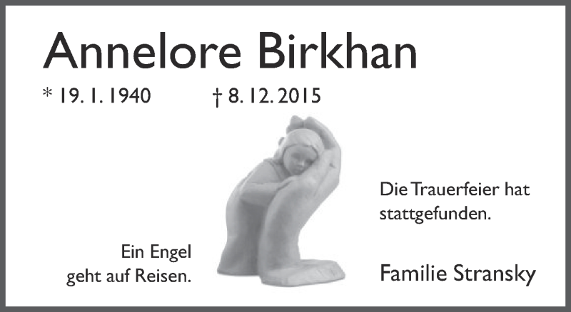 Hier finden Sie alle Traueranzeigen aus der Zeitung, die bisher für Annelore Birkhan erschienen sind. Weitere Traueranzeigen, die in der Zeitung erscheinen, werden hier ebenfalls aufgelistet
