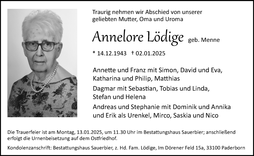 Hier finden Sie alle Traueranzeigen aus der Zeitung, die bisher für Annelore Lödige erschienen sind. Weitere Traueranzeigen, die in der Zeitung erscheinen, werden hier ebenfalls aufgelistet