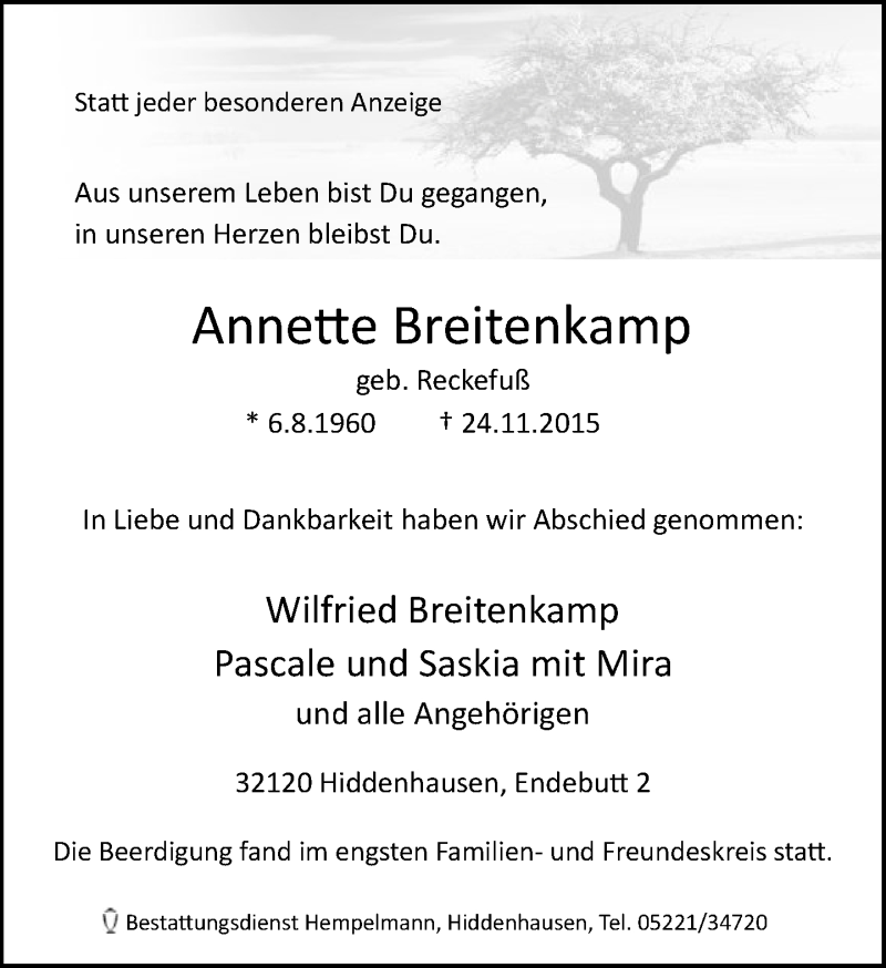 Hier finden Sie alle Traueranzeigen aus der Zeitung, die bisher für Annette Breitenkamp erschienen sind. Weitere Traueranzeigen, die in der Zeitung erscheinen, werden hier ebenfalls aufgelistet