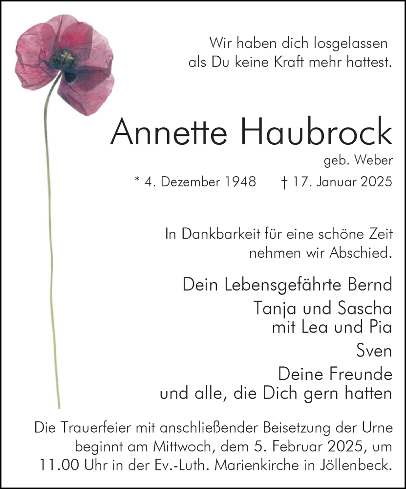 Hier finden Sie alle Traueranzeigen aus der Zeitung, die bisher für Annette Haubrock erschienen sind. Weitere Traueranzeigen, die in der Zeitung erscheinen, werden hier ebenfalls aufgelistet