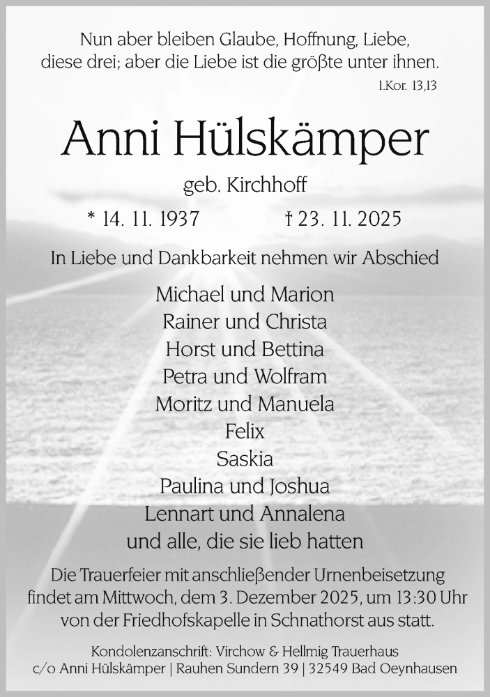 Hier finden Sie alle Traueranzeigen aus der Zeitung, die bisher für Anni Hülskämper erschienen sind. Weitere Traueranzeigen, die in der Zeitung erscheinen, werden hier ebenfalls aufgelistet