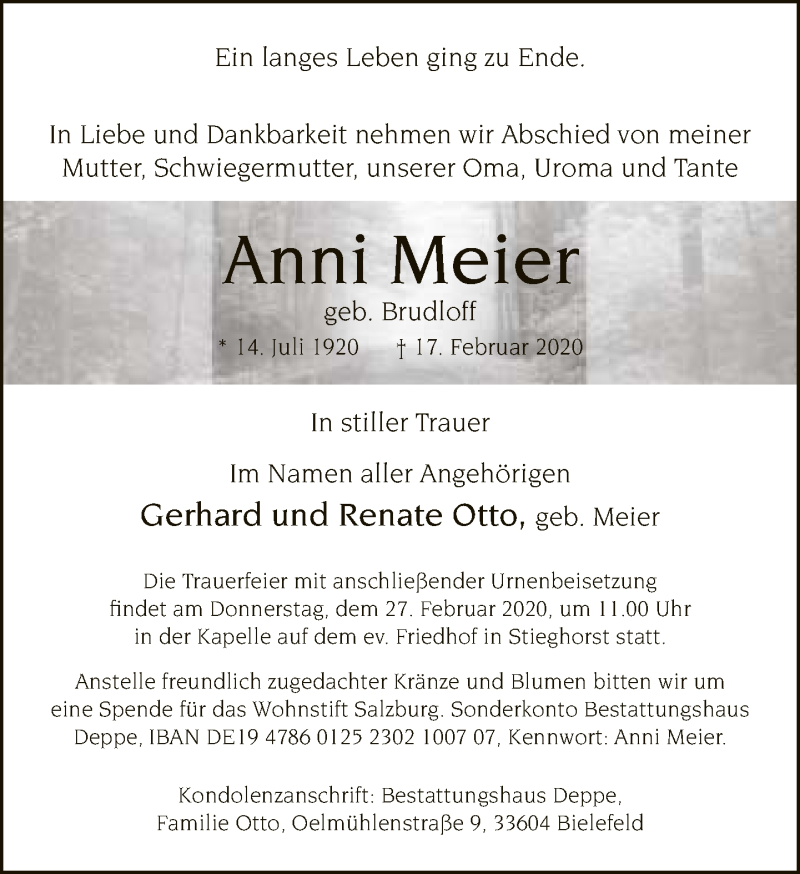 Hier finden Sie alle Traueranzeigen aus der Zeitung, die bisher für Anni Meier erschienen sind. Weitere Traueranzeigen, die in der Zeitung erscheinen, werden hier ebenfalls aufgelistet
