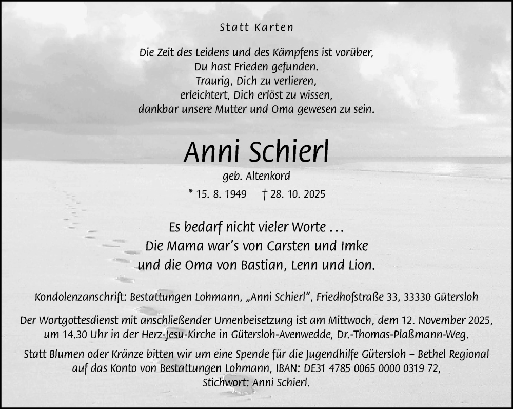 Hier finden Sie alle Traueranzeigen aus der Zeitung, die bisher für Anni Schierl erschienen sind. Weitere Traueranzeigen, die in der Zeitung erscheinen, werden hier ebenfalls aufgelistet