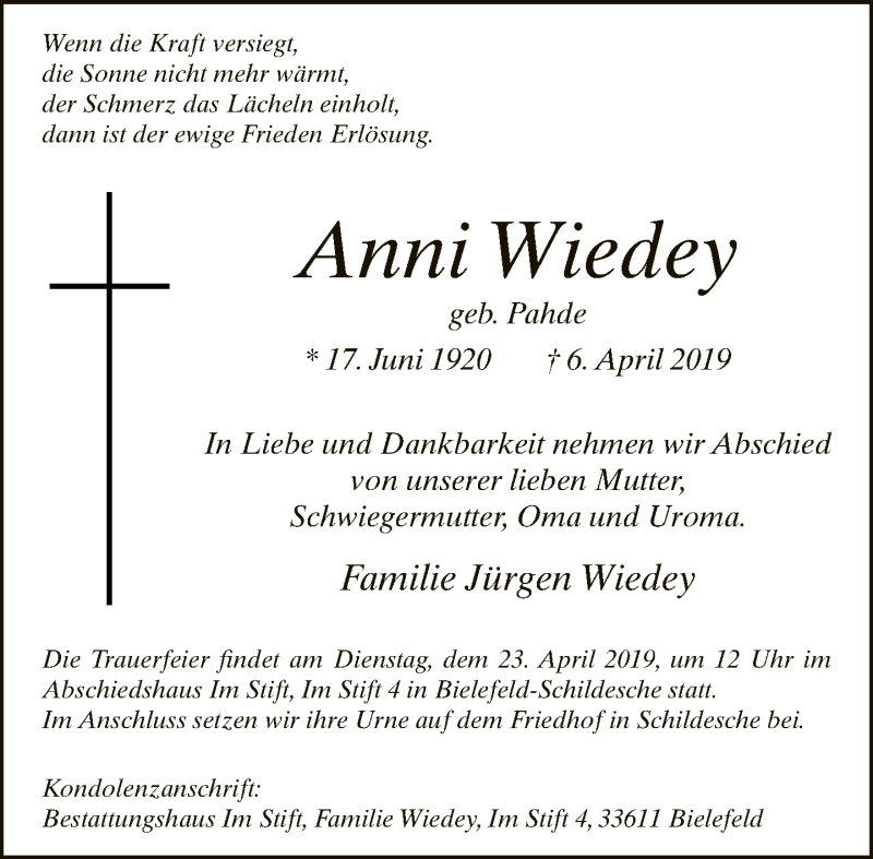 Hier finden Sie alle Traueranzeigen aus der Zeitung, die bisher für Anni Wiedey erschienen sind. Weitere Traueranzeigen, die in der Zeitung erscheinen, werden hier ebenfalls aufgelistet