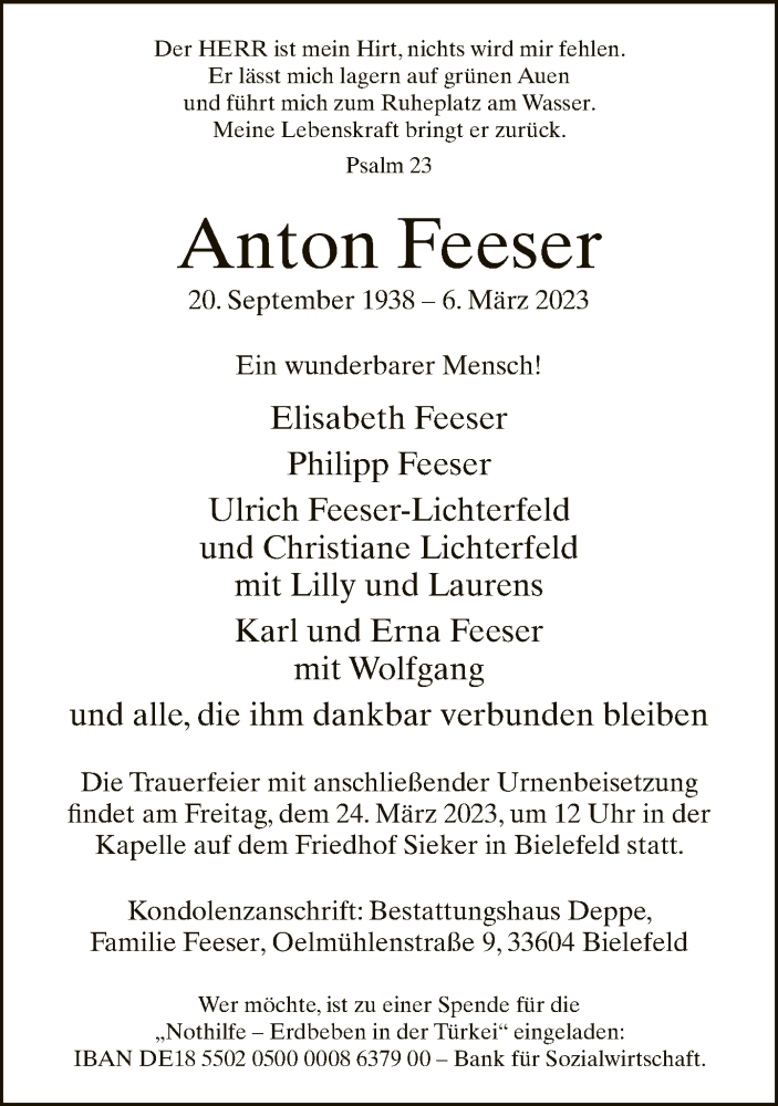 Hier finden Sie alle Traueranzeigen aus der Zeitung, die bisher für Anton Feeser erschienen sind. Weitere Traueranzeigen, die in der Zeitung erscheinen, werden hier ebenfalls aufgelistet