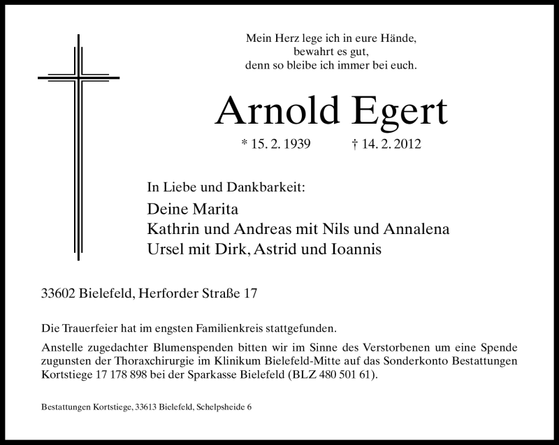 Hier finden Sie alle Traueranzeigen aus der Zeitung, die bisher für Arnold Egert erschienen sind. Weitere Traueranzeigen, die in der Zeitung erscheinen, werden hier ebenfalls aufgelistet