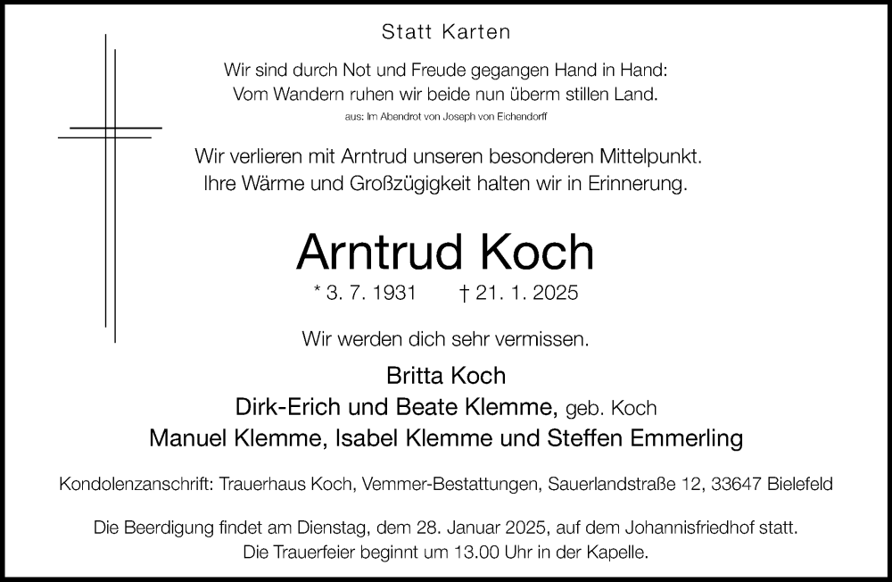 Hier finden Sie alle Traueranzeigen aus der Zeitung, die bisher für Arntrud Koch erschienen sind. Weitere Traueranzeigen, die in der Zeitung erscheinen, werden hier ebenfalls aufgelistet