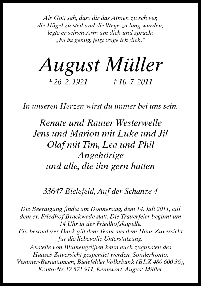 Hier finden Sie alle Traueranzeigen aus der Zeitung, die bisher für August Müller erschienen sind. Weitere Traueranzeigen, die in der Zeitung erscheinen, werden hier ebenfalls aufgelistet