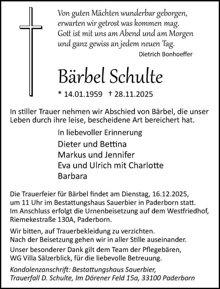 Hier finden Sie alle Traueranzeigen aus der Zeitung, die bisher für Bärbel Schulte erschienen sind. Weitere Traueranzeigen, die in der Zeitung erscheinen, werden hier ebenfalls aufgelistet