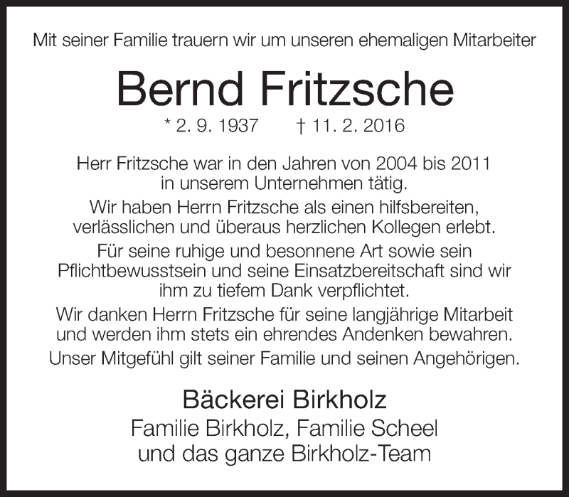 Hier finden Sie alle Traueranzeigen aus der Zeitung, die bisher für Bernd Fritzsche erschienen sind. Weitere Traueranzeigen, die in der Zeitung erscheinen, werden hier ebenfalls aufgelistet