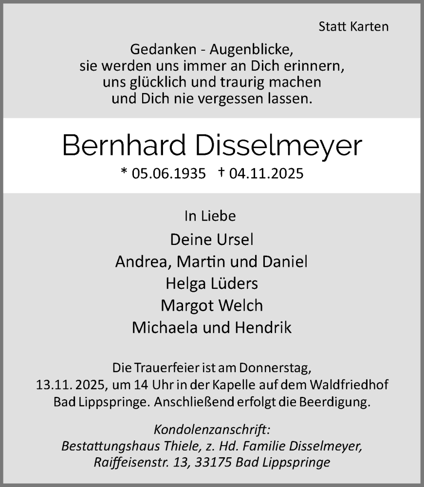Hier finden Sie alle Traueranzeigen aus der Zeitung, die bisher für Bernhard Disselmeyer erschienen sind. Weitere Traueranzeigen, die in der Zeitung erscheinen, werden hier ebenfalls aufgelistet
