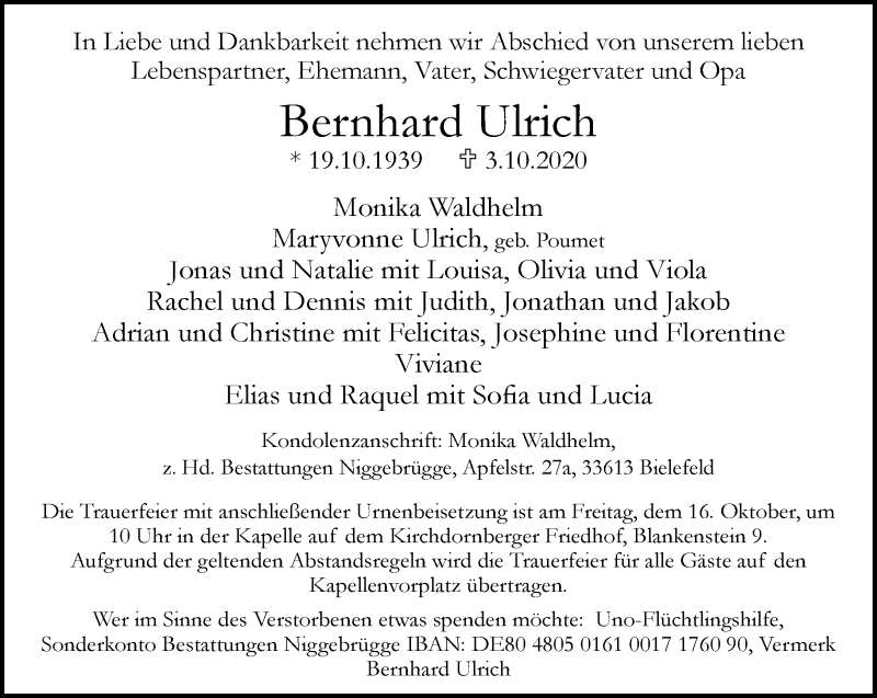 Hier finden Sie alle Traueranzeigen aus der Zeitung, die bisher für Bernhard Ulrich erschienen sind. Weitere Traueranzeigen, die in der Zeitung erscheinen, werden hier ebenfalls aufgelistet