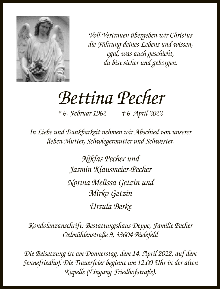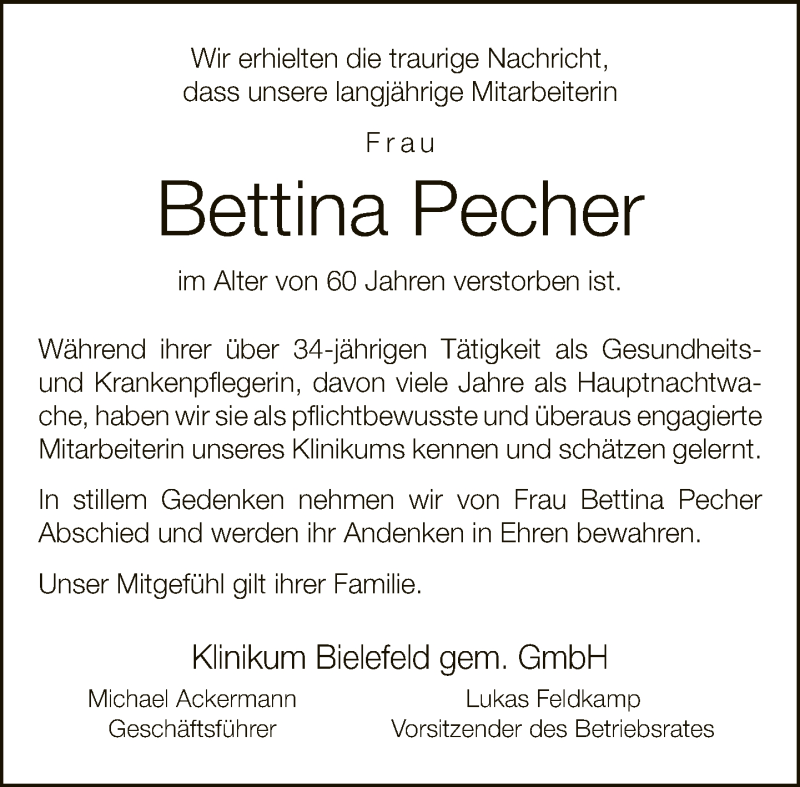 Hier finden Sie alle Traueranzeigen aus der Zeitung, die bisher für Bettina Pecher erschienen sind. Weitere Traueranzeigen, die in der Zeitung erscheinen, werden hier ebenfalls aufgelistet