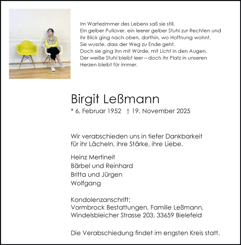 Hier finden Sie alle Traueranzeigen aus der Zeitung, die bisher für Birgit Leßmann erschienen sind. Weitere Traueranzeigen, die in der Zeitung erscheinen, werden hier ebenfalls aufgelistet