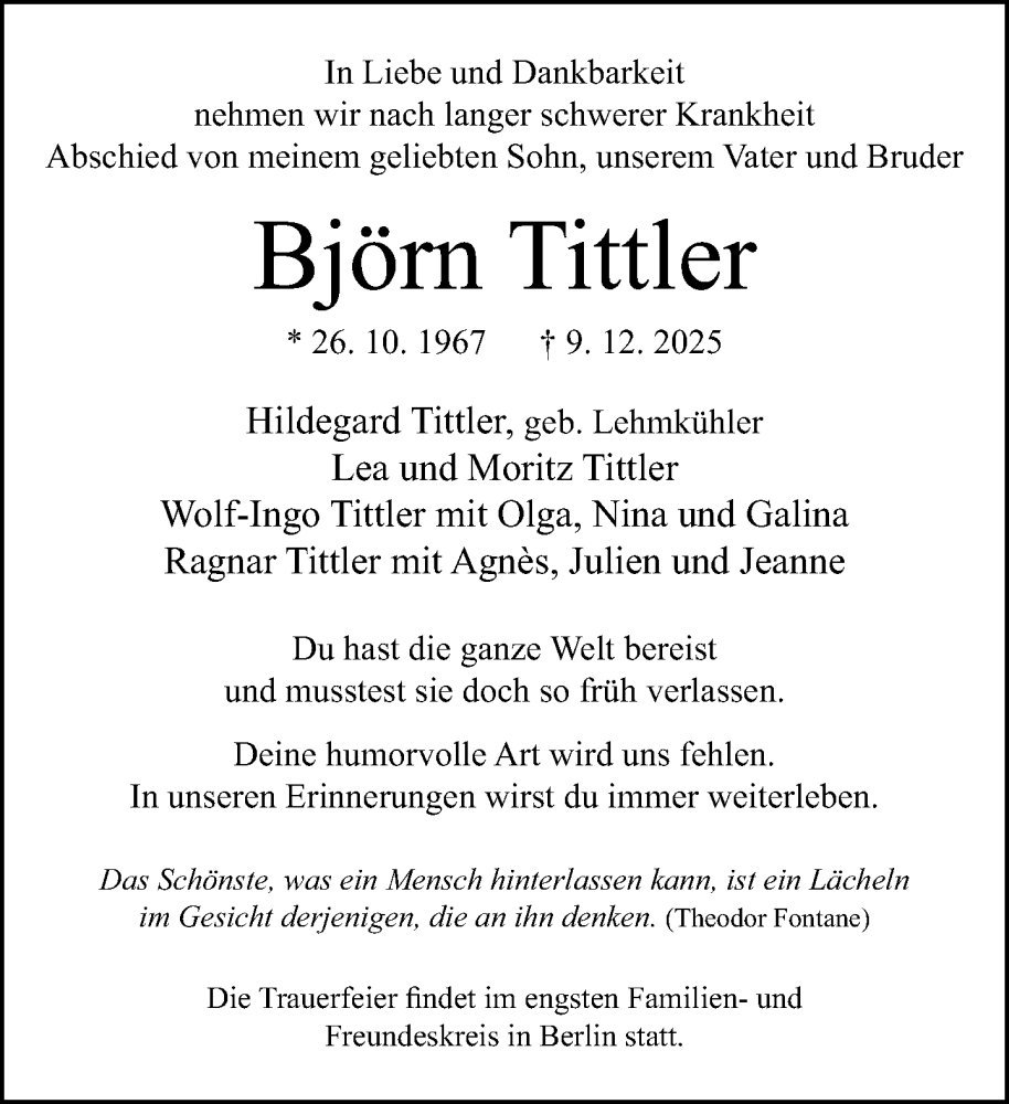 Hier finden Sie alle Traueranzeigen aus der Zeitung, die bisher für Björn Tittler erschienen sind. Weitere Traueranzeigen, die in der Zeitung erscheinen, werden hier ebenfalls aufgelistet