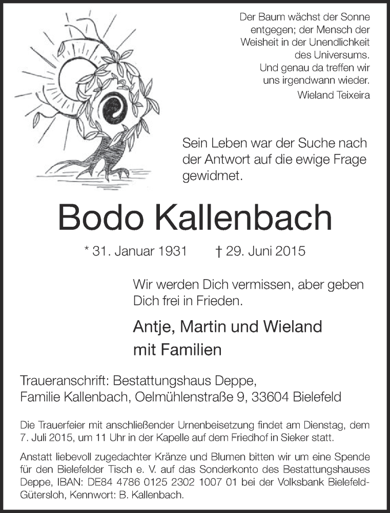 Hier finden Sie alle Traueranzeigen aus der Zeitung, die bisher für Bodo Kallenbach erschienen sind. Weitere Traueranzeigen, die in der Zeitung erscheinen, werden hier ebenfalls aufgelistet