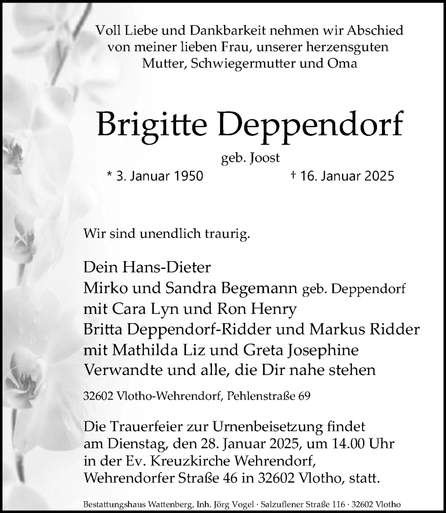 Hier finden Sie alle Traueranzeigen aus der Zeitung, die bisher für Brigitte Deppendorf erschienen sind. Weitere Traueranzeigen, die in der Zeitung erscheinen, werden hier ebenfalls aufgelistet