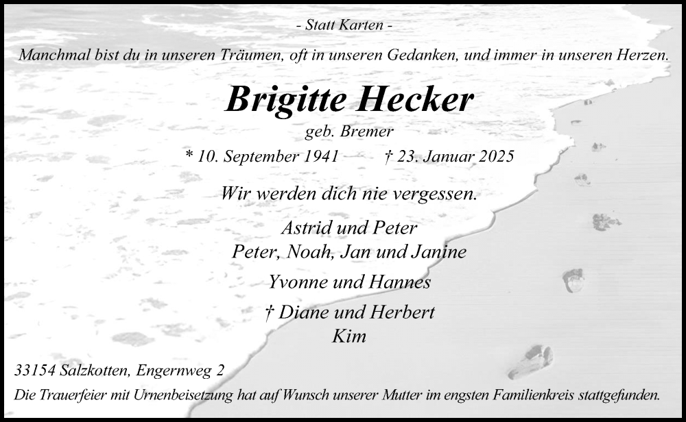 Hier finden Sie alle Traueranzeigen aus der Zeitung, die bisher für Brigitte Hecker erschienen sind. Weitere Traueranzeigen, die in der Zeitung erscheinen, werden hier ebenfalls aufgelistet