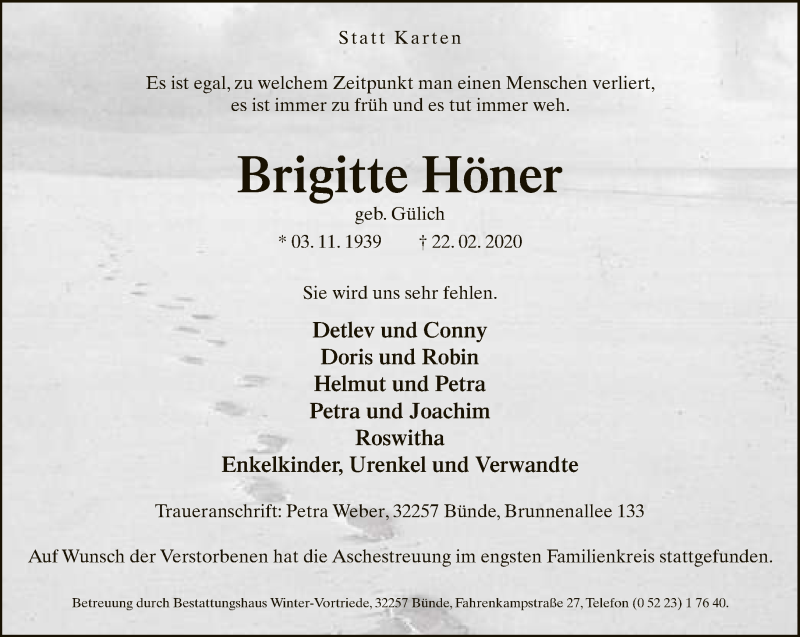 Hier finden Sie alle Traueranzeigen aus der Zeitung, die bisher für Brigitte Höner erschienen sind. Weitere Traueranzeigen, die in der Zeitung erscheinen, werden hier ebenfalls aufgelistet