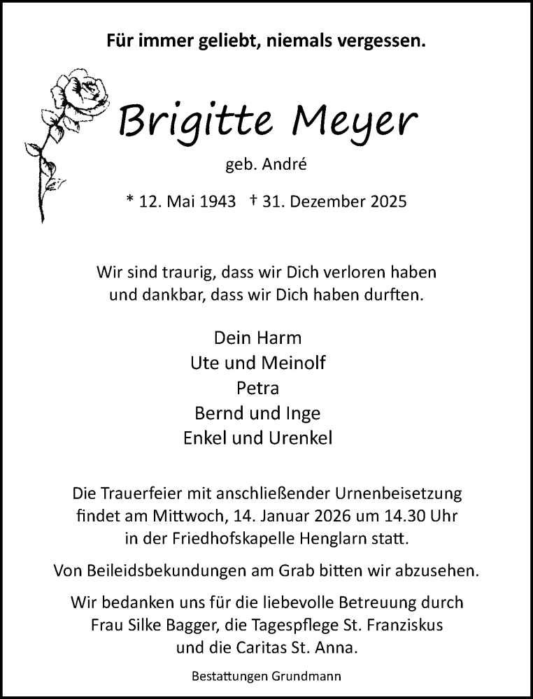 Hier finden Sie alle Traueranzeigen aus der Zeitung, die bisher für Brigitte Meyer erschienen sind. Weitere Traueranzeigen, die in der Zeitung erscheinen, werden hier ebenfalls aufgelistet
