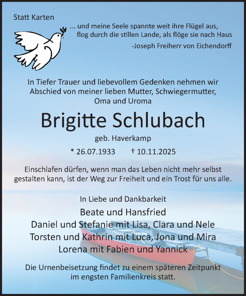 Hier finden Sie alle Traueranzeigen aus der Zeitung, die bisher für Brigitte Schlubach erschienen sind. Weitere Traueranzeigen, die in der Zeitung erscheinen, werden hier ebenfalls aufgelistet