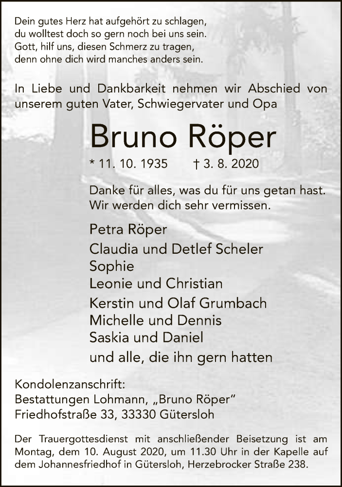Hier finden Sie alle Traueranzeigen aus der Zeitung, die bisher für Bruno Röper erschienen sind. Weitere Traueranzeigen, die in der Zeitung erscheinen, werden hier ebenfalls aufgelistet