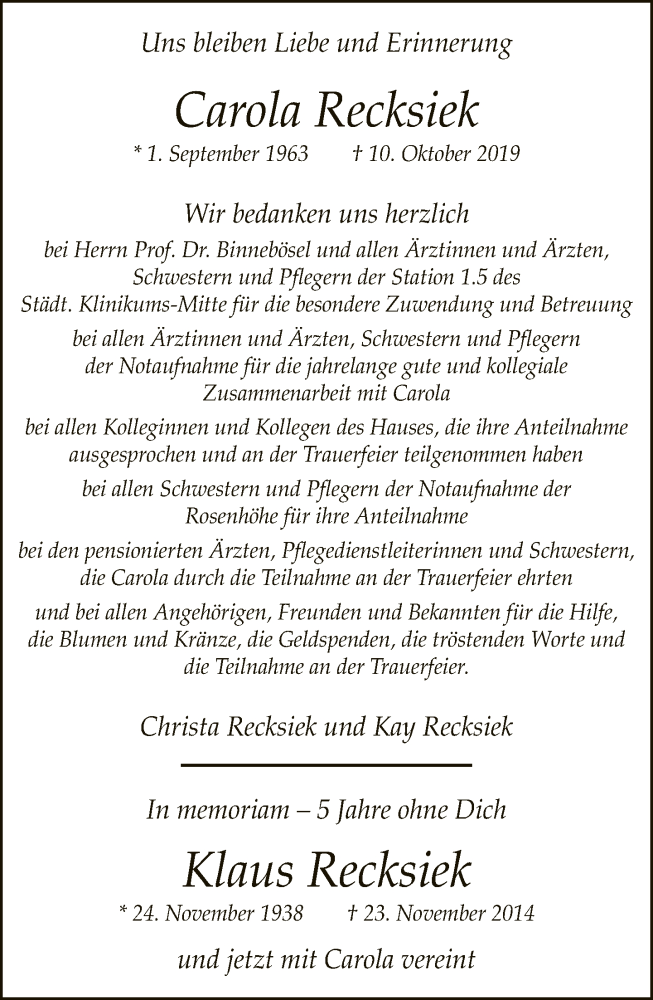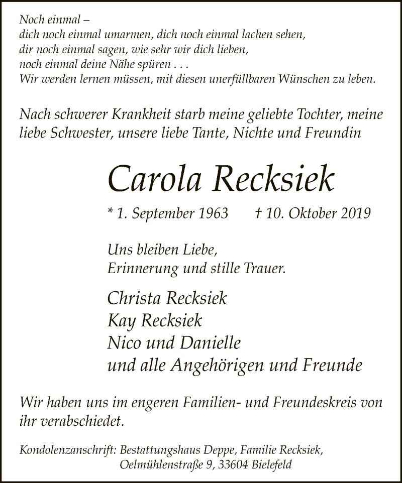 Hier finden Sie alle Traueranzeigen aus der Zeitung, die bisher für Carola Recksiek erschienen sind. Weitere Traueranzeigen, die in der Zeitung erscheinen, werden hier ebenfalls aufgelistet