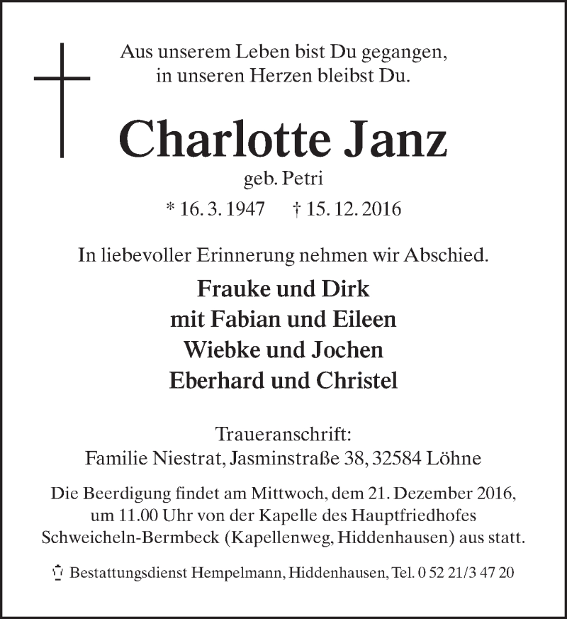 Hier finden Sie alle Traueranzeigen aus der Zeitung, die bisher für Charlotte Janz erschienen sind. Weitere Traueranzeigen, die in der Zeitung erscheinen, werden hier ebenfalls aufgelistet