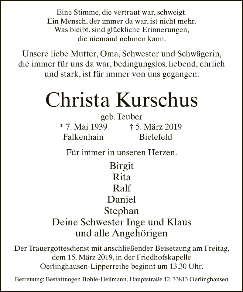 Hier finden Sie alle Traueranzeigen aus der Zeitung, die bisher für Christa Kurschus erschienen sind. Weitere Traueranzeigen, die in der Zeitung erscheinen, werden hier ebenfalls aufgelistet