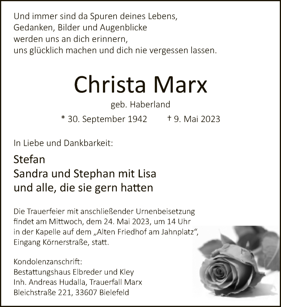Hier finden Sie alle Traueranzeigen aus der Zeitung, die bisher für Christa Marx erschienen sind. Weitere Traueranzeigen, die in der Zeitung erscheinen, werden hier ebenfalls aufgelistet