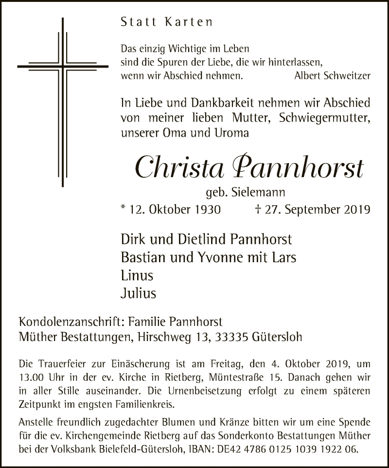 Hier finden Sie alle Traueranzeigen aus der Zeitung, die bisher für Christa Pannhorst erschienen sind. Weitere Traueranzeigen, die in der Zeitung erscheinen, werden hier ebenfalls aufgelistet