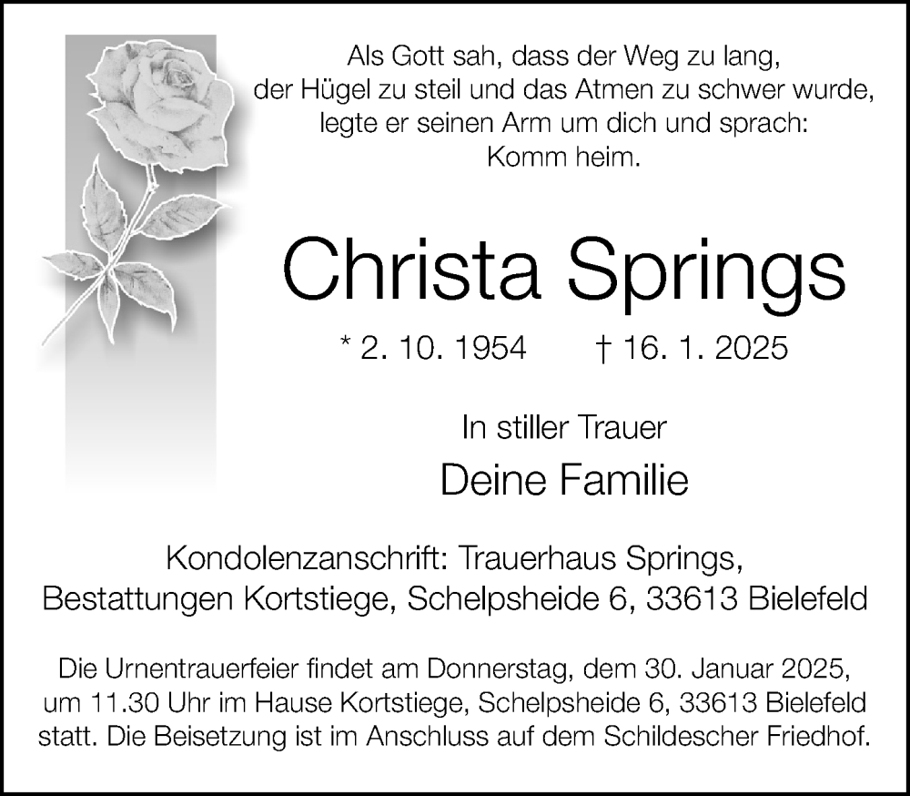 Hier finden Sie alle Traueranzeigen aus der Zeitung, die bisher für Christa Springs erschienen sind. Weitere Traueranzeigen, die in der Zeitung erscheinen, werden hier ebenfalls aufgelistet