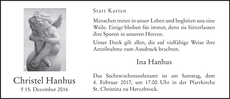 Hier finden Sie alle Traueranzeigen aus der Zeitung, die bisher für Christel Hanhus erschienen sind. Weitere Traueranzeigen, die in der Zeitung erscheinen, werden hier ebenfalls aufgelistet