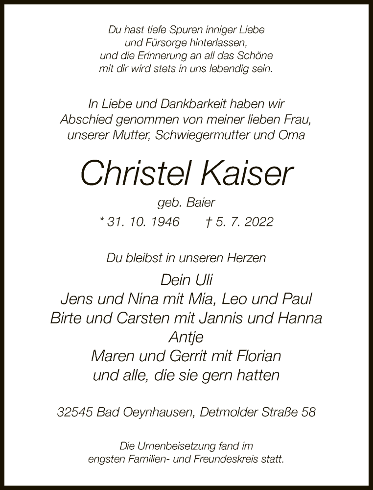 Hier finden Sie alle Traueranzeigen aus der Zeitung, die bisher für Christel Kaiser erschienen sind. Weitere Traueranzeigen, die in der Zeitung erscheinen, werden hier ebenfalls aufgelistet