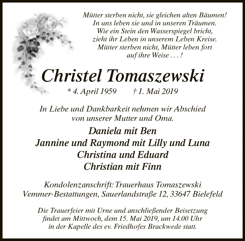 Hier finden Sie alle Traueranzeigen aus der Zeitung, die bisher für Christel Tomaszewski erschienen sind. Weitere Traueranzeigen, die in der Zeitung erscheinen, werden hier ebenfalls aufgelistet