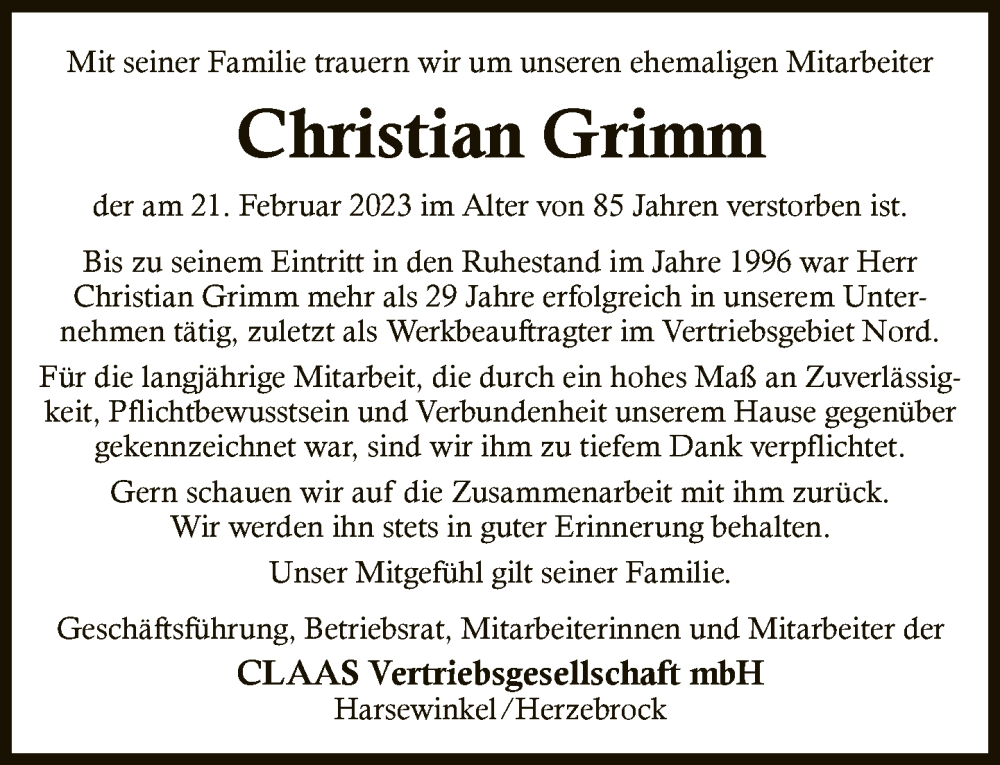 Hier finden Sie alle Traueranzeigen aus der Zeitung, die bisher für Christian Grimm erschienen sind. Weitere Traueranzeigen, die in der Zeitung erscheinen, werden hier ebenfalls aufgelistet